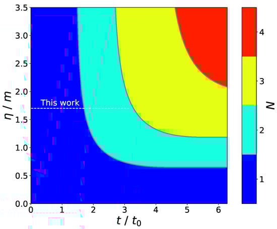 Required number N of qubits as a function of dimensionless time and the coupling-to-mass ratio , where . To ensure that the target fidelity of 90% is attained, we can simulate the system using two bosonic qubits up to time .