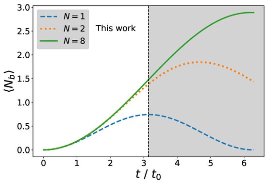 To examine how the truncation affects the dynamics of the system at hand, we perform classical simulations of the truncated system with , , and (cf. Figure 2). Here, the truncation at the large value is chosen in order to ensure that the system dynamics does not change upon a further increase in N. As expected, we find a large deviation in the average boson number between the (blue dashed curve) and (orange dotted curve) in the relevant time interval but a small deviation between the and case (green curve).