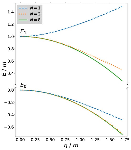 Energy-to-mass ratio of the ground state and first excited state as a function of the coupling-to-mass ratio . A truncation with is insufficient to approximate the first excited state, even at low coupling strengths. The truncation with shows excellent agreement with the ground state and good qualitative agreement with the first excited state.