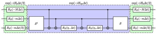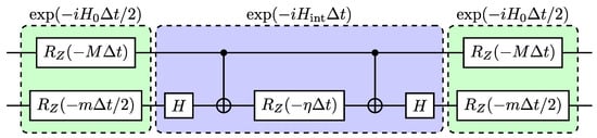 The general approach to perform the time evolution of such a Hamiltonian with non-commuting terms is based on the Trotter–Suzuki decomposition, also known as Trotterization. To be more specific, for the Hamiltonian [cf. Equations (23) and (24)], our starting point is the standard second-order Trotter–Suzuki product formula [,]