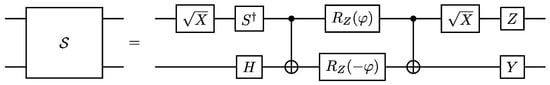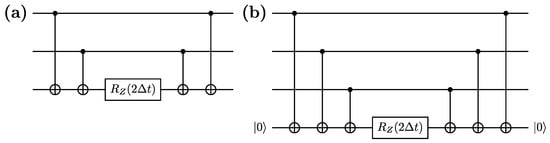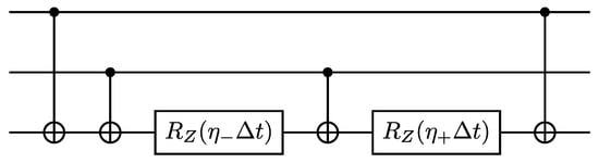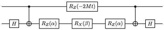 The final circuit, which emulates the system dynamics over a finite-evolution time t using only two CNOT gates, then assumes the form depicted in Figure 7. In connection with the form of this circuit, it is worthwhile to point out that circuit compressions of the type utilized here have quite recently been discussed in the context of interacting qubit arrays described by the transverse-field Ising and models [,], paradigmatic models in condensed-matter physics. These models can be mapped to free fermionic models and are also known to be classically simulatable with polynomial resources []. It is thus interesting that the fermion–boson system under consideration offers another, much less common example—namely, that of an -coupled pair of qubits, with mutually unequal external fields in the z-direction acting on either qubit [cf. Equations (23) and (24)]—where such a circuit compression is also possible.