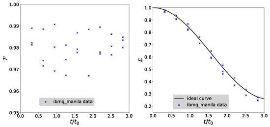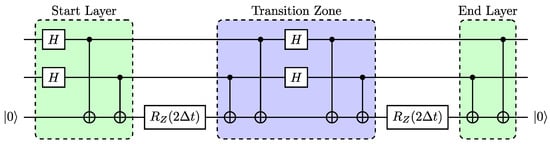 The inherent tradeoff pertaining to such a decomposition is that a smaller time step corresponds to a longer circuit. The last expression for is typically approximated using first-order Trotter–Suzuki-type decomposition [,]. For a time-independent Hamiltonian , the latter approximates by , with the corresponding error being upper bounded by , where N is the number of qubits [].