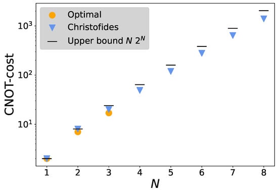 We also address cases with larger boson number truncations by providing the CNOT cost estimate for the corresponding quantum circuits. We perform this based on an analogy of our circuit optimization with the traveling salesman problem (TSP) [], adapting an idea proposed in ref. []. To this end, we make use of the exact solution of the TSP based on the Bellman–Held–Karp dynamic programming algorithm [,], as well as the Christofides algorithm, a polynomial-time heuristic that approximately solves the TSP on a metric graph []. Being polynomial in character, the latter can be utilized for much larger boson number truncations than the exact solution.