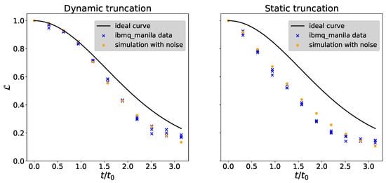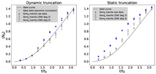 As discussed in Section 3.3, a truncation of the (infinite-dimensional) boson Hilbert space is required in order to perform a DQS with a finite number of qubits. The ideal truncation nontrivially depends on the initial state of the system , the coupling strength , and the total simulation time t. Throughout this work, we focus entirely on interaction quenches starting from the vacuum state as the initial state of the system. This obviates the need to consider the dependence of the system dynamics following a quench on the initial state. While theoretical estimations of the truncation required to keep the truncation error below a certain threshold are known [], we will rely on classical simulations of our few-qubit quantum systems in order to determine the ideal qubit requirements. Our algorithm works as follows: