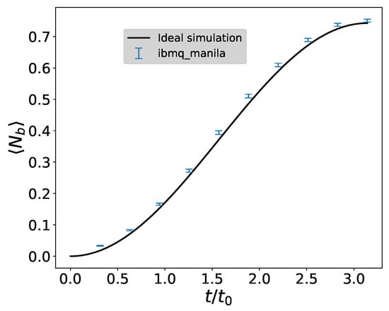 The results obtained using this algorithm are depicted in Figure 1. As can be inferred from the latter, with , we can simulate the dynamics of the system up to a time , where , with an accuracy of using a boson truncation of (). Bearing in mind the limited hardware resources of current quantum computers, we choose this system with a boson truncation of (i.e., two bosonic qubits) as our reference system for DQS on an IBM quantum computer. This system shows nontrivial dynamics, thus being a useful test bed for benchmarking purposes.
