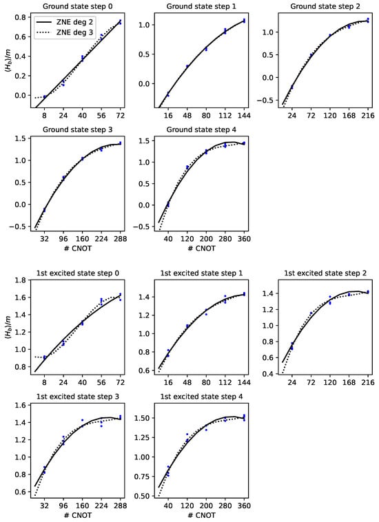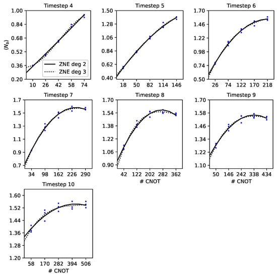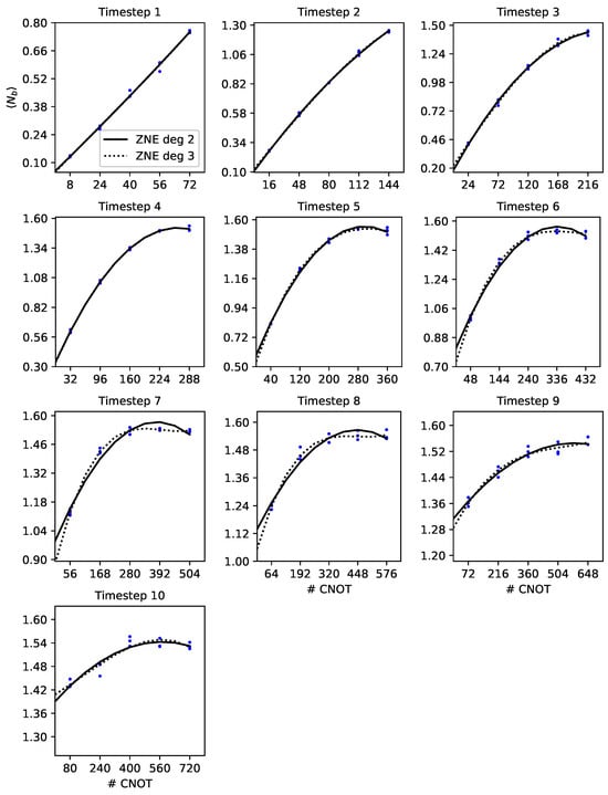 The remainder of this paper is organized as follows. In Section 2, we introduce the relevant fermion–boson system and its underlying Hamiltonian. Section 3 starts with a short introduction into our scheme for describing the system dynamics after an interaction quench via DQS, followed by a brief recapitulation of our adopted approaches for encoding fermion and boson states. At the end of this section, we also address the issue of the controllable truncation of the bosonic Hilbert space. Section 4 starts with the design of low-depth quantum circuits emulating the dynamics of the system, first in the two-qubit case and then in the three-qubit case. This is followed by an analysis of the CNOT cost for higher boson number truncations. Finally, this section ends with a brief review of the basic aspects of the zero-noise extrapolation technique of error mitigation. The principal results obtained for the system dynamics on IBM Q are presented in Section 5. We summarize the main findings and conclude the paper in Section 6. Some cumbersome derivations, as well as relevant mathematical and computational details, are relegated to Appendix A, Appendix B, Appendix C, Appendix D, Appendix E and Appendix F.