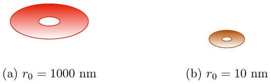 In this article, we explore two distinct configurations of QRs. The first, with a smaller average radius, and , is suitable for investigating optical properties. The second, with and , is only used to obtain the graphs of the electronic properties. These choices align with experiments on 2D mesoscopic rings in the literature [99,100]. These two configurations are illustrated in Figure 2.