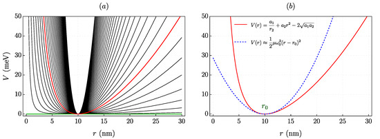 (Online color) (a) Profile of the Tan–Inkson potential (Equation (3)) for different parameters and (b) comparison with the harmonic approximation potential (Equation (7)). In (a), and ranges from 0 to (black curves), with a range. The green curve () has no confinement potential. The red curve in (a) matches the one in (b). In (b), and ; the blue curve represents the harmonic approximation.