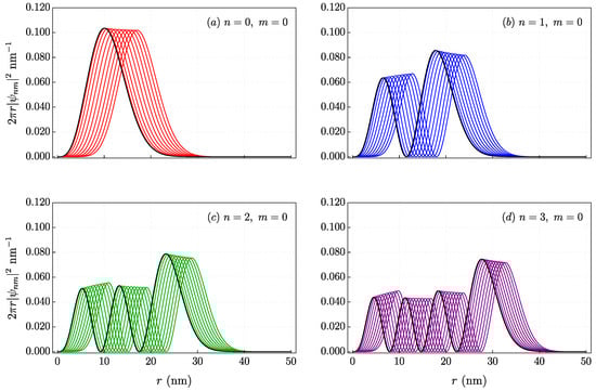 Figure 5 shows the probability distribution function for the first three quantum numbers n with , where we can observe that for the ground state (Figure 5a), we have a single peak (indicating a maximum value) representing a higher probability density of finding the particle. When we look at the first excited states (Figure 5b–d), more peaks appear, but with lower probabilities. These peaks represent regions of localized probability of finding the particle. The graphs were constructed for different values of B, ranging from 0 to with an interval of between each curve. It can be observed in each graph that the higher the value of the magnetic field (represented by the black curve in each graph), the higher the value of the probability distribution and the closer it will be to the center. This shows that the presence of the magnetic field is significant in the behavior of the particle in the quantum ring.