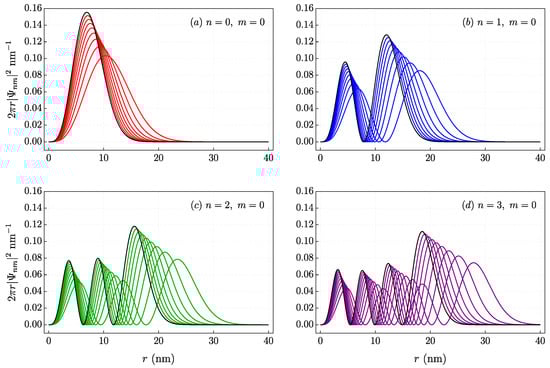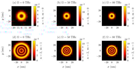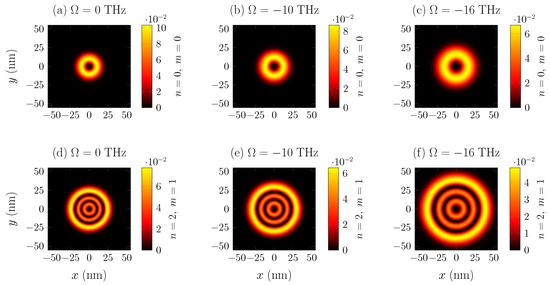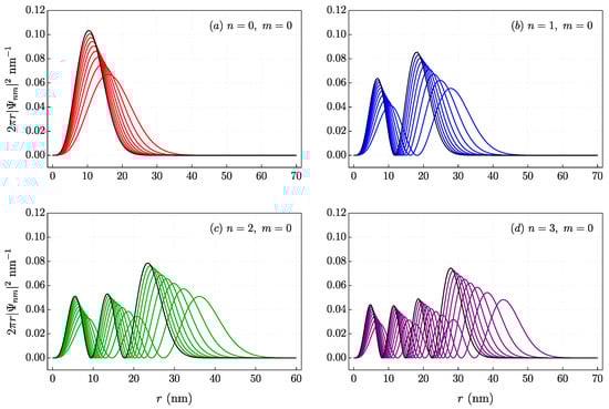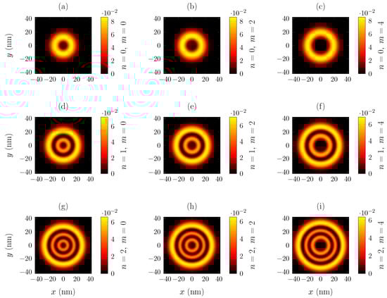 A very intuitive way to visualize the annular geometry of the QRs is by constructing the probability distribution function in the plane of the density function. Figure 7 shows a set of density plots corresponding to the solution given by Equation (18) in the transverse plane normalized by in nanometers for different quantum numbers n and m.