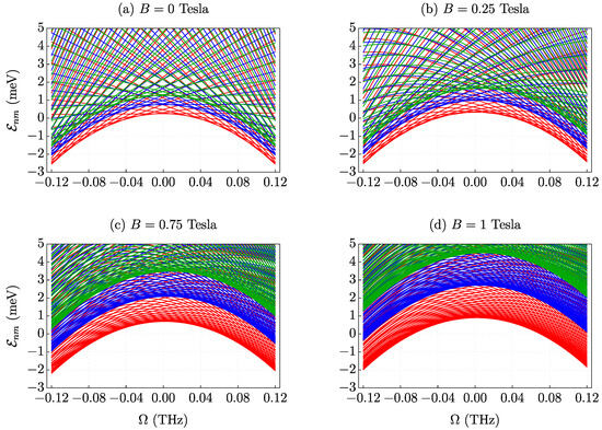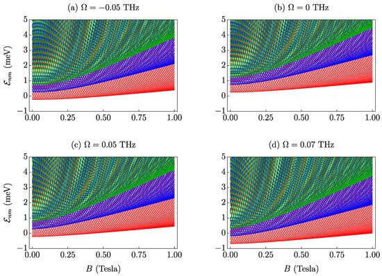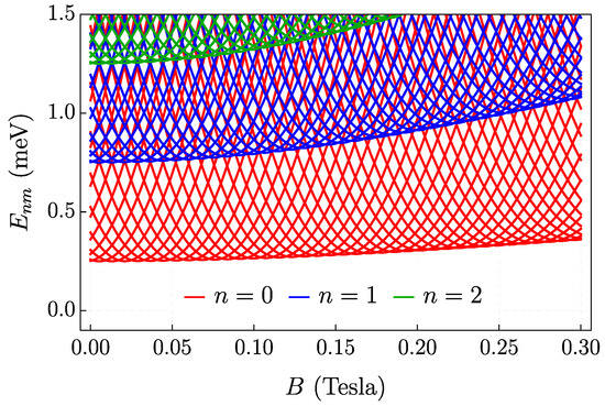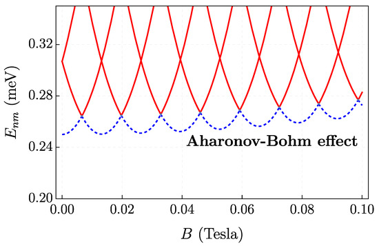 The degeneracy of states for the quantum ring can be observed in Figure 9, where we outline the energy spectrum as a function of the magnetic field. Each line represents a distinct quantum number m, while lines of the same color represent the same quantum number n, which characterizes a subband of the system. In other words, each curve represents a distinct state of the system. It can be observed that the energy spectrum as a function of the applied magnetic field is aperiodic, especially when more than one subband is occupied [85].