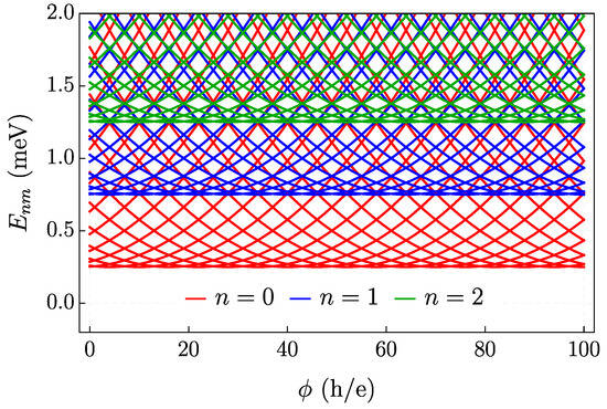 Figure 11 presents the energy eigenvalues as a function of the magnetic flux for the three lowest subbands. It is observed that the energy spectrum exhibits periodicity concerning the AB flux, with a period of [85]. Furthermore, the graph shows that energy levels can occupy multiple subbands. Additionally, as shown in Figure 9, the energy minima of each subband increase for larger values of n.