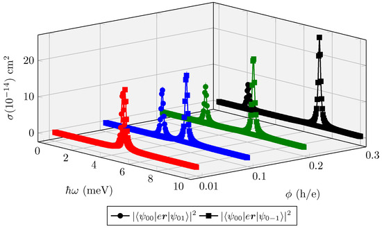 Figure 12 shows the PCS, from Equation (22), as a function of (the incident photon energy) for different values of . We can see that as the AB flux varies, the amplitudes of the PCS peaks change proportionally for two optical transitions starting from the ground state to adjacent states, following the selection rule. The reason for such behavior is that the wave function depends on the applied AB flux. Furthermore, it can be observed that the peak position undergoes a shift towards lower energies (redshift) with the increase in AB flux, where the optical transition occurs from the state to the state . The opposite effect is observed when the transition occurs from the state to , where the PCS peaks shift to higher energy values as the AB flux increases (blue shift). The explanation for this behavior lies in the energy difference between the two states involved in the optical transition. For example, the redshift indicates that the energy difference between the two considered quantum states decreases as the AB flux increases. On the other hand, the opposite occurs with the blue shift, which is graphically represented by the separation between the peaks of the two transitions as the AB flux increases, such that for the curves of the two transitions overlap. To demonstrate this effect more explicitly, we consider transitions between states with and , respectively, given by