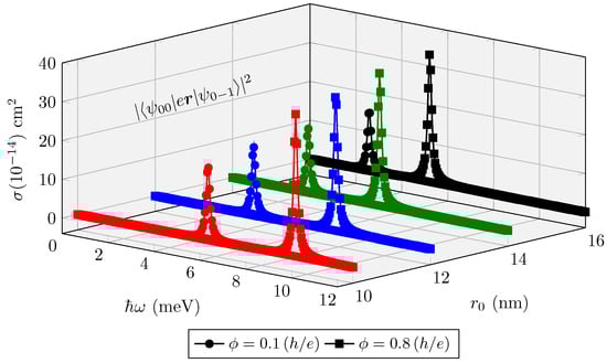 In this section, we investigate the photoionization cross-section (PCS) of a two-dimensional quantum ring composed of GaAs. We also show how the AB flux manifests when some model parameters are varied. This model was previously studied by Xie [44], who investigated the effects of AB flux on the PCS in two-dimensional QRs. However, Xie’s approach does not entirely follow the Tan–Inkson model. Here, we will rigorously follow the Tan–Inkson derivation, as presented in Section 2, to derive the solutions with specific quantum transitions and parameters for application to the PCS formula. Therefore, we can conclude that the contribution in this section is largely novel to the literature.