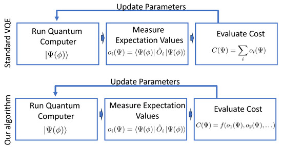 Flow diagram for standard VQE (top) and our algorithm (bottom). Here, is a set of variational parameters, are arbitrary operators, are expectation values, and f is an arbitrary function.