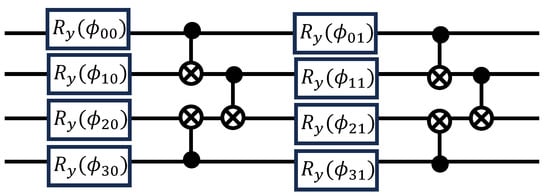 Two layers of the hardware-efficient ansatz are shown in Figure 3. Each layer consist of a stack of Y-rotations followed by alternating CNOT gates. The Y-rotations are parameterized by the variational parameter where q indicates the qubit and l indicates the layer. Throughout our demonstration, we use a 2-layer ansatz.