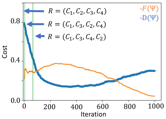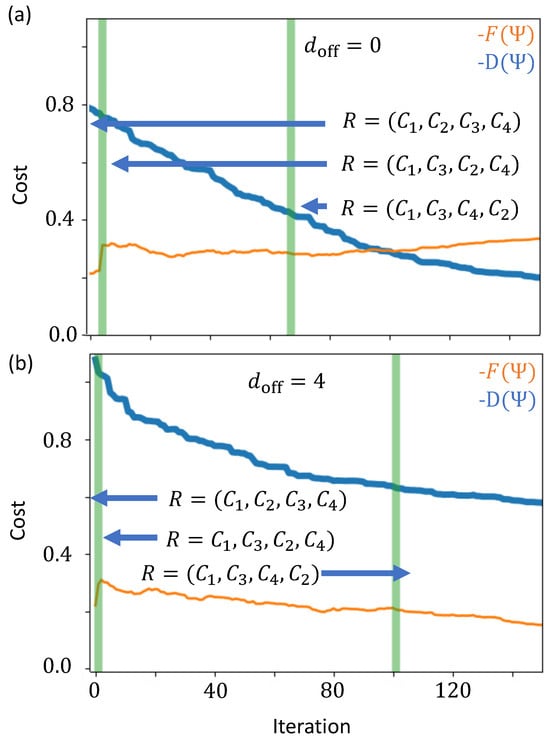 Figure 4 shows the cost functions during each iteration k of the algorithm, where the parameter increases with the iterations. The cost function is separated into the distance portion and the tour restriction portion . We find that the distance portion of the cost function is originally optimized past the point of a full tour. As a increases, the route restriction portion of the cost function begins to dominate the optimization and the quantum state is pushed into a full tour. The green vertical lines in Figure 4 divide the iterations into regions with different candidate tours. The candidate tour in a given iteration region is indicated on the figure by the route R, where the arrows point to the regions in which R is applicable. We see that is smooth across these boundaries but can be discontinuous. Despite these discontinuities, we find the optimal route within 100 iterations. Even after the optimal tour is found, the cost function continues to fluctuate until it converges around 1000 iterations.