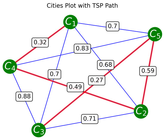 For a test case we consider the random selected graph shown in Figure 6. We create this graph from random symmetric matrices. The matrix elements are generated from the uniform distribution between 0 and 1. The matrices are then symmetrized. The Python package NetworkX 3.5 is used to translate these random matrices into graphs. This randomly selected graph has the shortest route of length 1.66, following the path shown in red. This shortest route is found using brute force by looping over all routes and finding the one with the shortest length. The quantum algorithm described above is applied to this graph.