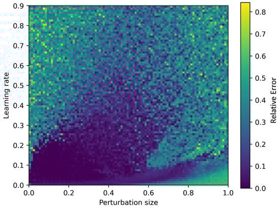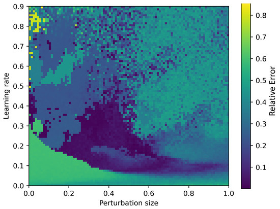 We also perform a hyperparameter search for this alternative cost function, shown in Figure 10. Again, perturbation size and learning rate are varied and the deviation between the final value of the cost function and the optimal value is plotted. As in the Lagrange multiplier method, we find a broad basin of convergence for and . Unlike in the Largrange multiplier method, the boundaries of the basin are smooth. The smoothness of the basin boundaries is a positive feature of the tour averaging method. It means that we can find the basin following the gradient of the cost function in the hyperparameter space. Additionally, the relative error is flat across the basin meaning that no fine tuning of the hyperparameters is necessary.