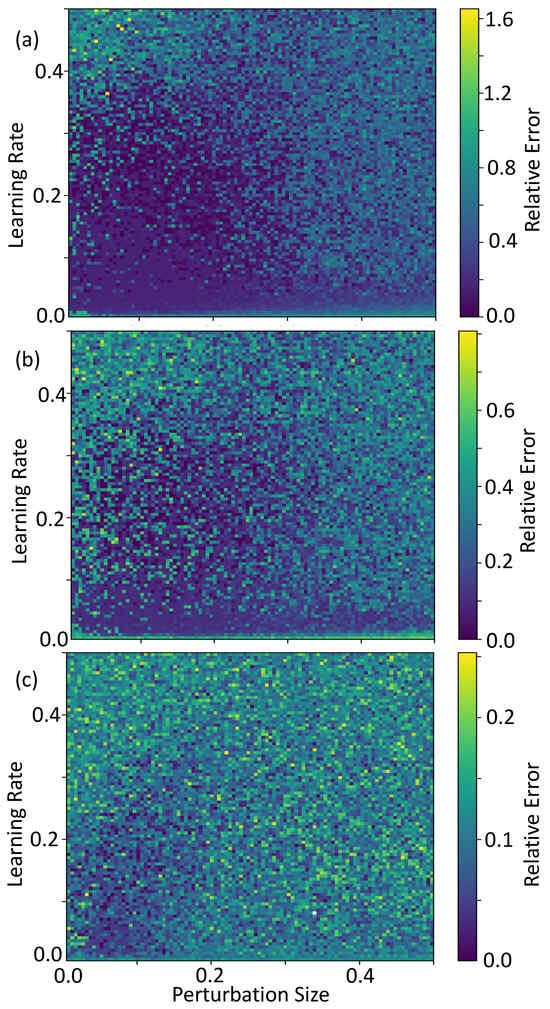 Throughout the entire hyperparameter scan, the relative error was never larger than 0.25 for the gamma distribution. Furthermore we find that in the range centered around a perturbation size with a learning rate , the relative error tends to be better. However, this basin is noisy. Thus, it may be necessary to fine-tune the hyperparameters in order to find good convergence.