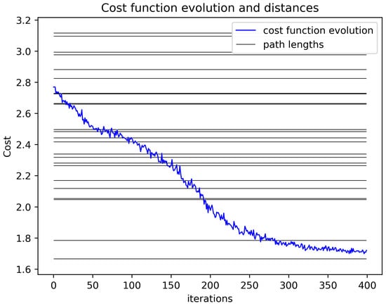 Alternative cost function evolution for our variational circuit training on the graph at Figure 6. The grey lines represent all possible route lengths and we note convergence to the smallest length in about 400 steps. At each iteration of this plot, 300 sample routes are chosen to compute an average.