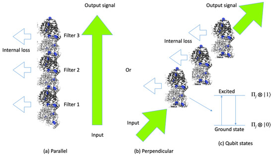 Input and output signals passing through tryptophan qubits in (a) parallel and (b) perpendicular directions. Tryptophans in tubulins depicted in blue color involve all excited or ground states in (c).