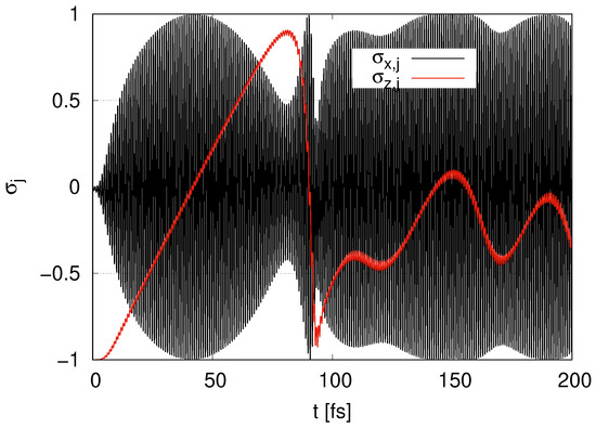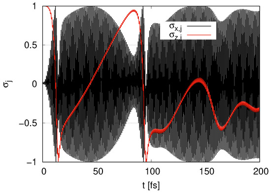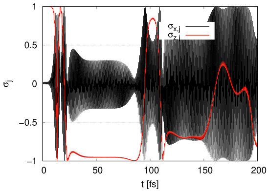 In Figure 2, we show the time evolution of and for layer with the initial condition . begins at 1 and rapidly decreases at around t = 20 fs. When is around zero, the amplitude of the oscillations of approaches its maximum value 1, where qubits are near with . When approaches , the amplitude of the oscillations of approaches its minimum value 0. At , gradually increases, and then the peak is less than 1 at around . At around , rapidly decreases and approaches , and the amplitude of the oscillations of approaches 1 at . At , gradually increases, and its peak is around . The maximum values of the peaks of gradually tend to decrease.