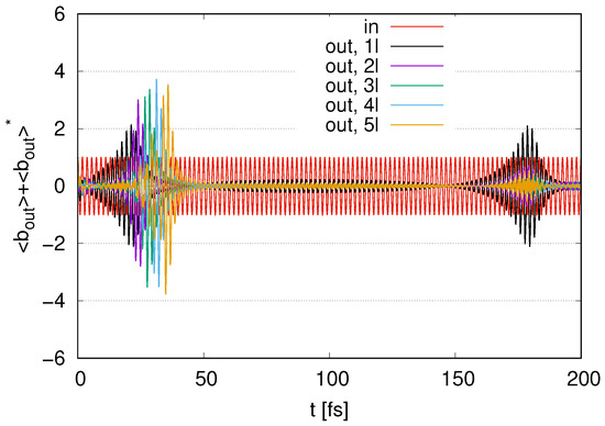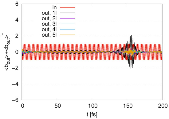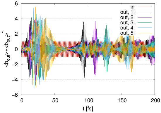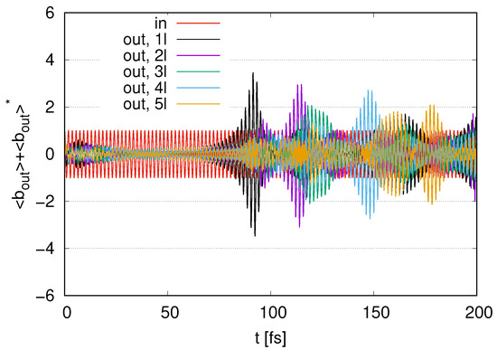 In Figure 12, we show the time evolution of the output signals for to 5 layers with and internal loss . We find fluctuations around zero at . The amplitudes of these fluctuations decrease as the number of layers increases. We find peaks in the amplitudes for the output signals at around . As the number of layers increases, the maximum values of the amplitudes decrease in the case of with , representing smaller output signals for larger . The amplitudes of the output signals in at around are larger than the input signal amplitudes, even for a nonzero . Meanwhile, in , represented by (5l), the amplitudes of the output signals are smaller than those for the input signal at all times. While an increase in the output signal in appears in Figure 11, the increase in the output signal in is suppressed in Figure 12 at all times by an internal energy loss with nonzero .
