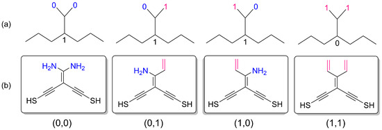 First, a minimal NAND motif constructed from alkynyl-modified iso-poly(acetylene) (iso-PA) backbones is considered. Logical inputs are encoded chemically: an NH2 cap denotes bit 0, detuning the branch from resonance, while a vinyl group (C=C) denotes bit 1, bringing the branch near resonance. The schematic NAND trees and their molecular analogues are shown in Figure 1, where specific substituents implement the input states , , and . In each case, the logical output is read directly from the transmission spectrum near the nodal energy: high transmission corresponds to output 1, while suppressed transmission signals output 0. The alkynyl linkers act as insulating standoffs, reducing the -channel transport which can obscure interference effects in the -system’s transport (see Appendix A). This convention mirrors the edge-encoding logic of NAND trees, where branch substitution toggles the effective self-energy relative to the reference energy.