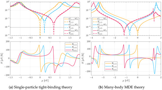 The transmission , conductance G, and Seebeck coefficient S for the -system of iso-PA NAND junctions are shown in Figure 2, for input states , , and , as obtained from Hückel (Figure 2a) and many-body MDE calculations (Figure 2b). In the Hückel theory results, the expected shifted-node pattern appears: the input pins the node near the reference energy (here ), while and shift the node depending on branch parity and coupling. In linear response with frozen geometries, the – and -junction responses are identical. These results closely match the tight-binding and density functional theory (DFT) calculations of Ref. [19], which employed longer alkynyl and phenyl linkers, suggesting that at the effective single-particle level the stub network, rather than the precise backbone, controls the interference pattern. As expected, each transmission node generates a conductance dip accompanied by a thermopower enhancement [39,53], rendering S an especially sensitive discriminator of logical states.