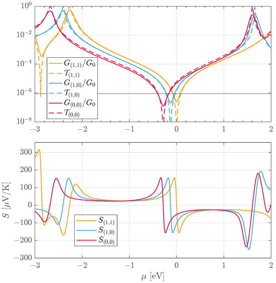 Importantly, QI features also leave a distinct imprint on the thermoelectric response [38,39,40,41,42,43,44,45]. As a transmission node is approached, charge and entropy currents vanish at different rates; their ratio, the Seebeck coefficient, can be strongly enhanced, serving both as a potential route to improved thermoelectric performance and as a practical diagnostic of interference zeros. Whereas conductance is often highly sensitive to variations in contact hybridization, molecular conformation, and other microscopic details [46,47,48,49,50,51] which may obscure the readout of a quantum circuit, the thermopower reflects the first transport moment of the transmission function via the Mott relation [52]. As such, the thermopower for energies near the node is largely insensitive to the microscopic junction details when the nodes is detuned from resonance [40], but remains highly sensitive to the position, scaling, and dephasing of those nodes [53,54,55], making it a robust indicator of nodal structure and, by extension, of the logical state.