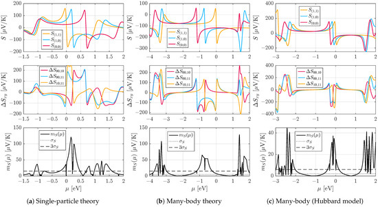 Calculated thermopower S, Seebeck contrast , and discrimination margin for iso-PA-based NAND molecules as a function of chemical potential , obtained using three levels of theory: (a) Single-particle Hückel tight-binding theory, (b) Many-body MDE theory, and (c) MDE theory with local Coulomb interactions (Hubbard model with ). As indicated in the lower panels of each subfigure, the logical output can be discriminated among NAND inputs , , and by evaluating the thermopower response. While all approaches capture interference-induced nodes that underpin logical discrimination, the position, splitting, and magnitude of the thermopower peaks differ substantially, underscoring the sensitivity of readout fidelity to the underlying electronic structure treatment. Horizontal dotted and dashed lines correspond to one and three times a representative experimental uncertainty = 5 V/K, respectively, chosen within the V/K range established by single-molecule thermopower measurements [83,84,85]. Transport calculations are for junctions operating at room temperature, = 300 K.