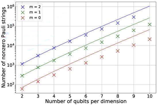 , direct reconstruction becomes computationally prohibitive; therefore, we relied solely on the coefficient computation routine without full matrix reconstruction. The plot displays the counts of the resulting Pauli terms as crosses, and the theoretical upper limit from Equation (