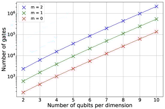 Figure 2 illustrates the results of the numerical simulation, showing how the gate counts vary with the number of qubits per dimension. We created a software program designed to produce a circuit corresponding to one Trotter step and for each collection of commuting Pauli strings. Each group’s circuit is output in QASM format for later integration into several Trotter steps. Following this, the overall gate count was ascertained from these output files. In systems where the qubit count is small, specifically