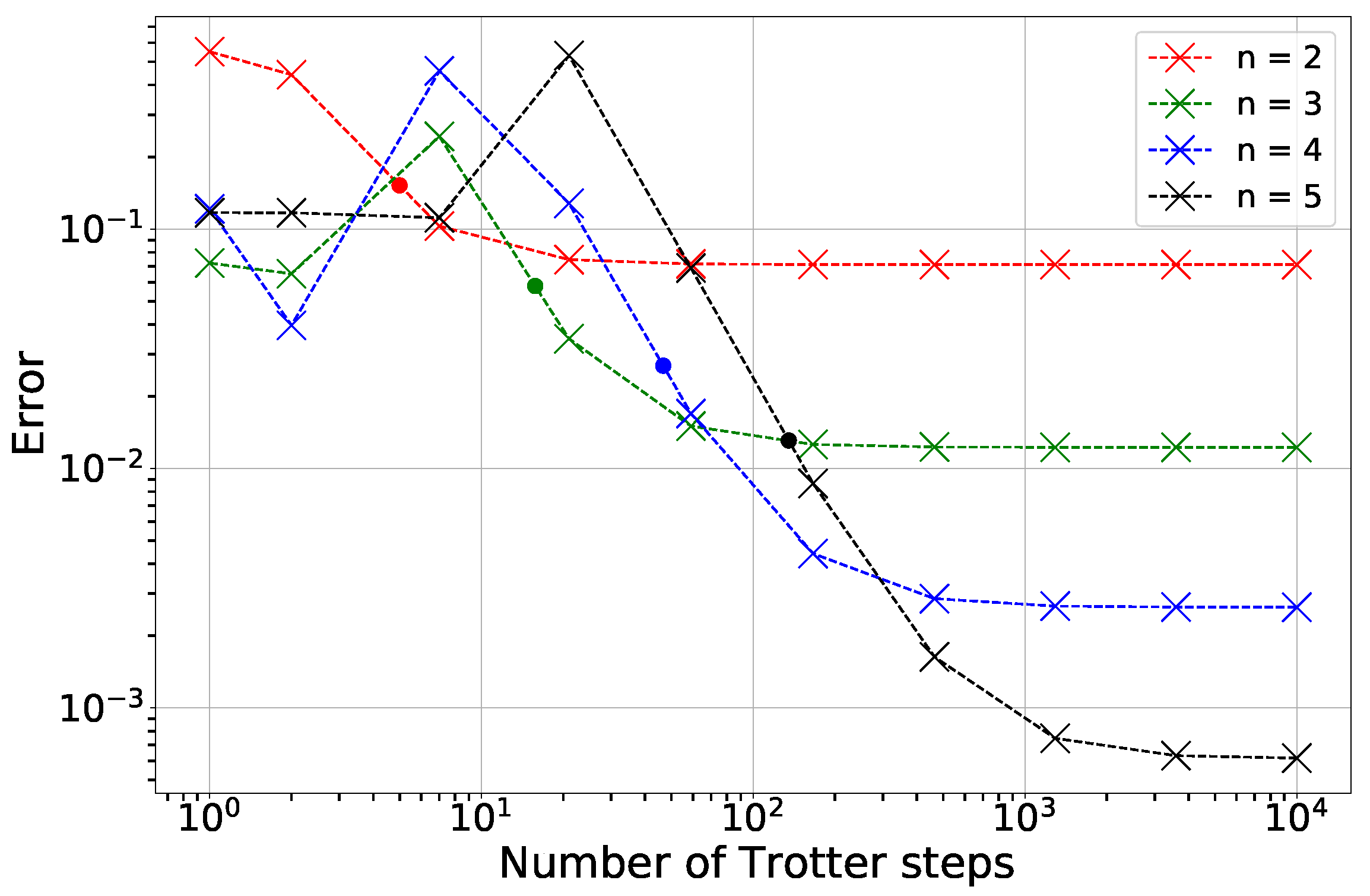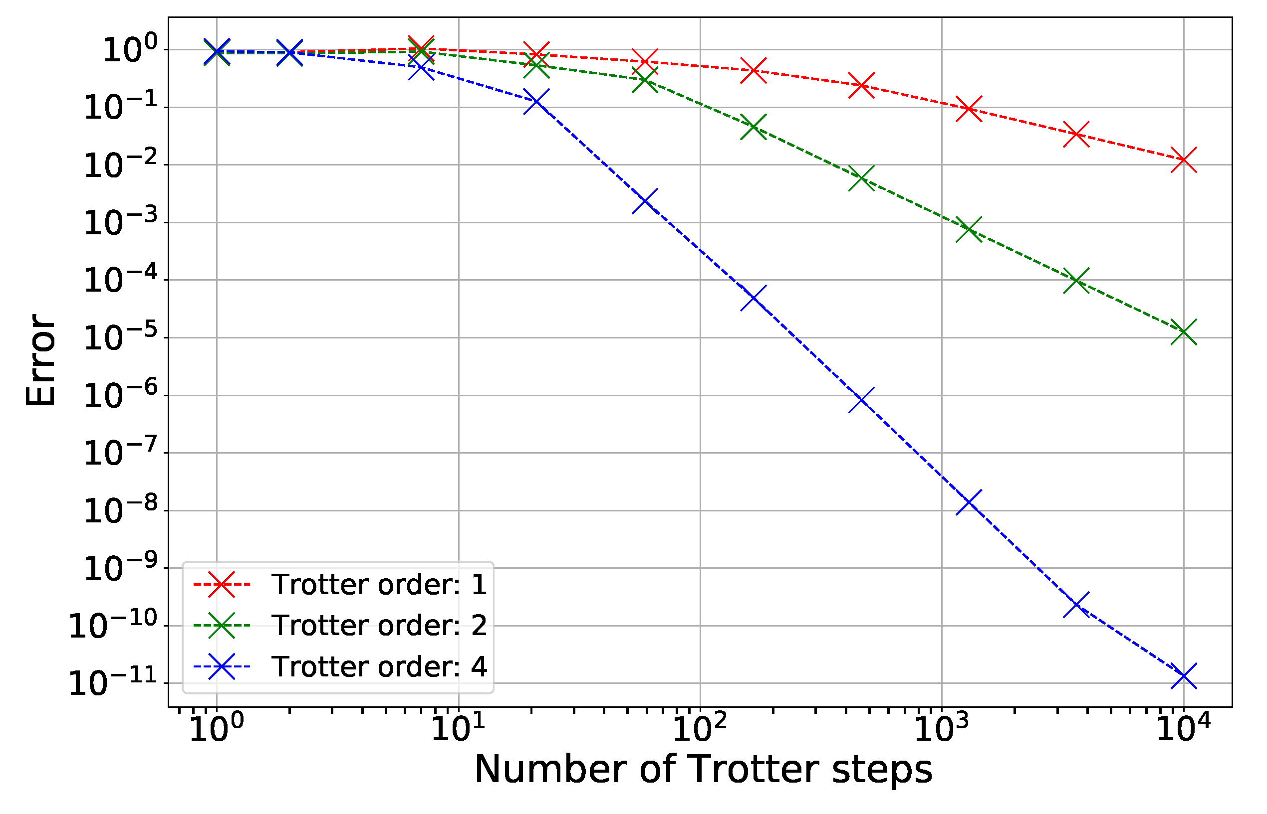 Figure 3 illustrates how the error varies with both the quantity of Trotter steps and the Trotter order. As anticipated, the error diminishes when the number of steps or the formula’s order is raised. This outcome confirms our implementation and offers a pragmatic calculation of the Trotter steps needed to reach a specified error threshold.