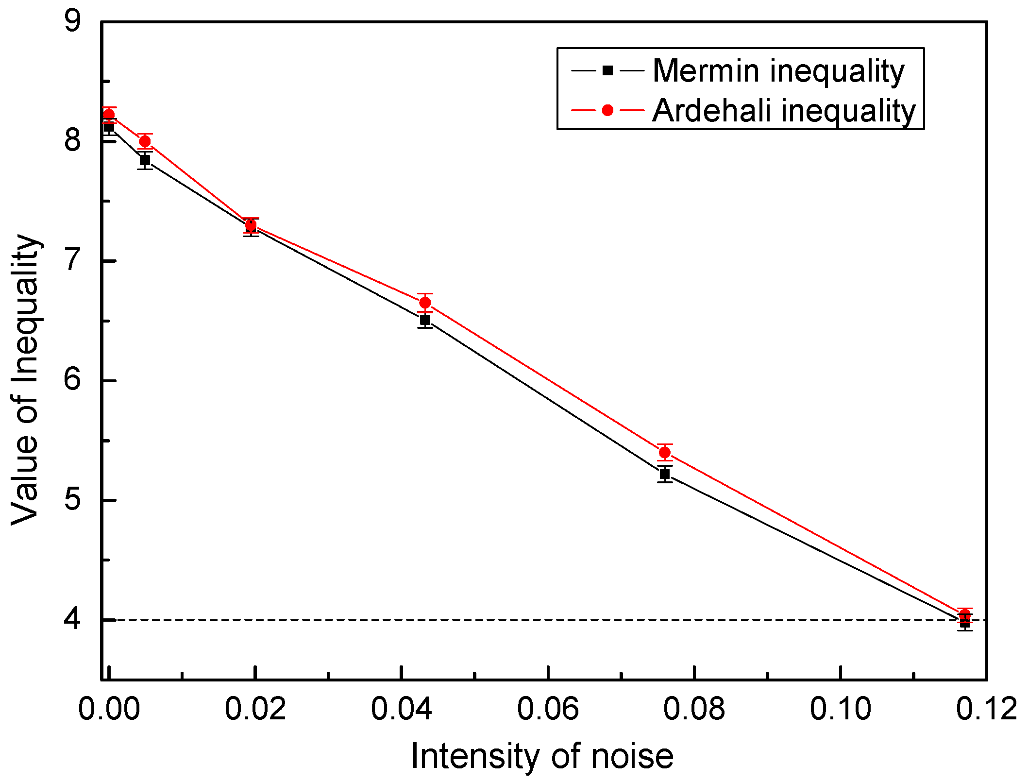- Almeida, M.L.; Barrett, S.J.; Toth, G.; Acin, A. Noise robustness of the nonlocality of entangled quantum states. Phys. Rev. Lett. 2007, 99, 040403. [Google Scholar] [CrossRef]