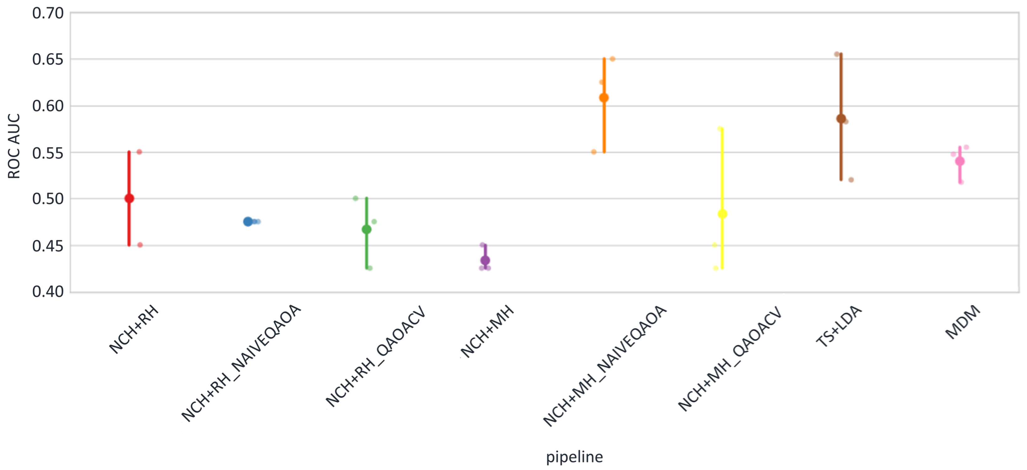47]. Only two pipelines, namely TS + LDA (AUROC = 0.59) and NCH + MH_NAIVEQAOA (AUROC = 0.61), were significantly better than the chance level (AUROC = 0.5833).