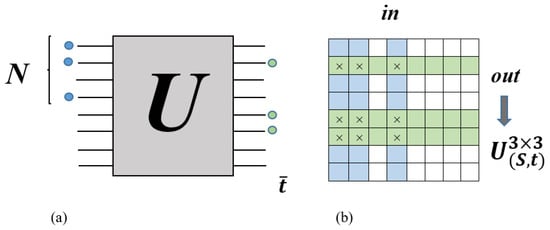 is made from the intersection of the columns and rows of the matrix U, which corresponds to the position of input modes (the columns have been selected by the input modes) and output modes (the rows have been selected by the output modes) of the interferometer, respectively (Figure 2) [].