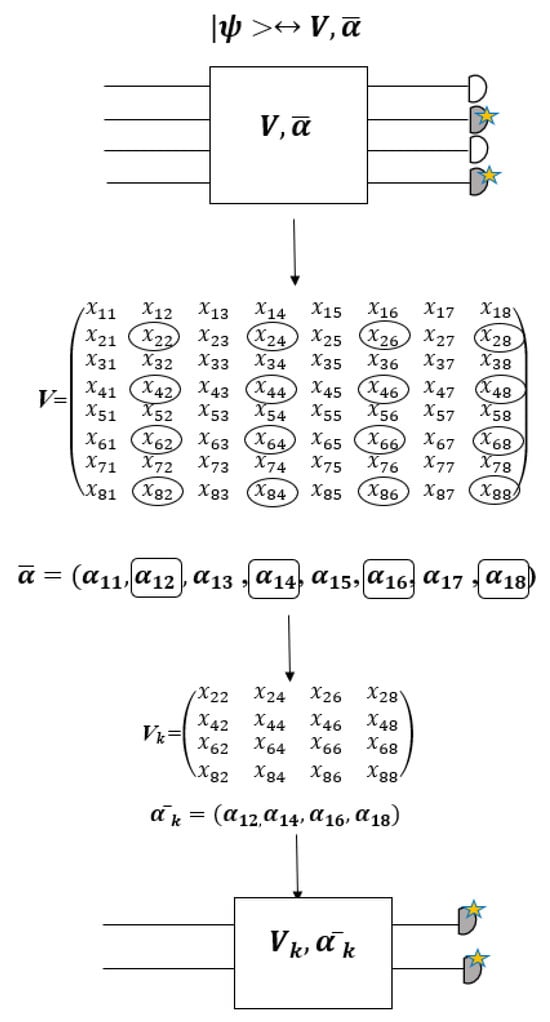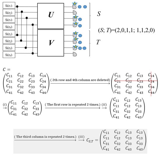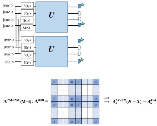 The As is a submatrix of A (2N × 2N) obtained through the location of the output modes of detected photons (j), contrary to BS, where the structure of the obtained submatrix corresponds to the mode positions of input and output. The As structure is created by selecting rows and columns j, and j + M of A when sj = 1. The rows and columns j and j + M are removed from A if sj = 0, and repeated sj times when sj > 0 [,,] (Figure 3) [].
