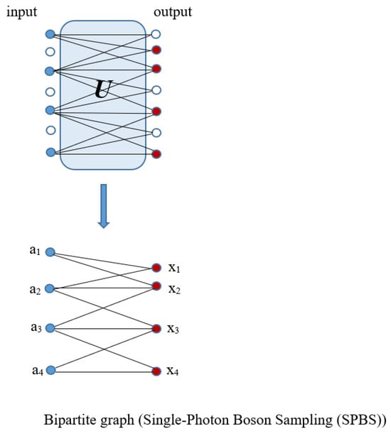 According to Figure 7, which explains the connection between Boson Sampling and graphs, to calculate the probability of an output, all probable pathways from input photons to the output that relate to the interferometer must have been considered. In fact, in single-photon Boson Sampling, all paths could be designated through all perfect matchings of a bipartite graph of Us,t (Equation (1)) where input modes, s, and output modes, t, are vertex sets of a bipartite graph and the edges are the paths between them [].