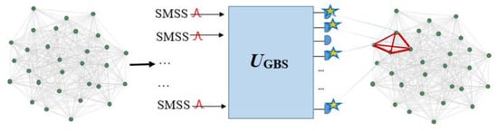 An ideal pure Gaussian state could be produced from the vacuum via an arrangement of single-mode squeezed states, single-mode displacement operations, and M-mode linear optical interferometry [,,,]. So, contrary to inputs of BS that are single photons, GBS uses squeezed vacuum states as inputs, where is the squeezing gate, and by applying this gate to the vacuum, a squeezed state can be ready [,]. In this equation, rj is the input squeezing parameter in the jth mode. is a displacement gate, which, for a Gaussian state with zero mean , produced by only single-mode squeezing and then linear interferometry, the displacement is zero (displacement: the operation that produces a coherent state from the vacuum []). Also, linear optical interferometry in M mode with unitary matrix U can act on operators as follows: [,,].