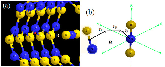 (a) BNB located at distance R from the B-N unit of a BNNT ring; (b) and , and , with R= (0, 0, R) and rij = rj − ri + R. The red arrow demonstrate the distance between atom N from B2N to atom B from center of BNNT.