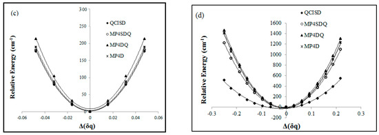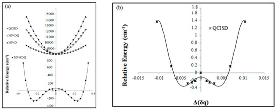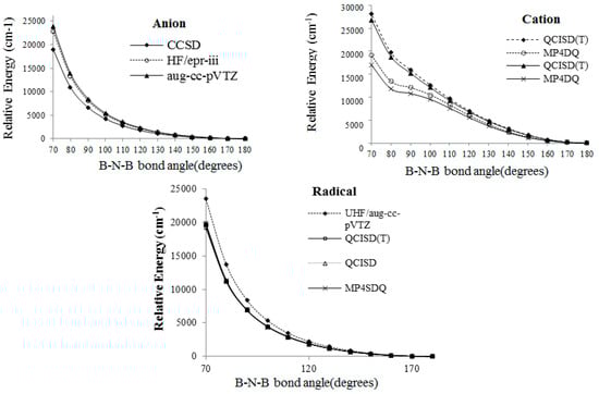 In addition, , which is an excited state with a molecular orbital sequence of (above ), obeys the Jahn–Teller effect. The further excited state is related to the of the triplet state. As can be seen in Figure 3, according to Knight’s works [4], a cyclic radical or anion B2 could not appear. In the cation structure, a bulge can be observed at 90° in the calculation of the MP4DQ and MP4DSQ levels of theory; therefore, this bulge confirms a cyclic B2.