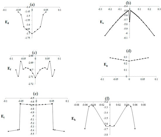 In Table 4, the calculation data for m062x with Epr-ii and 6-31g* can be seen and compared with B3P86 and B3LYP, showing lower values. Interestingly, both the m062x and B3LYP methods show attraction for BN (−, 0) B and repulsion for BN (+) B with the BNNT ring. Table 1 lists the energy differences for the global minima and local minima for both and . It also confirms that the total energies for both methods are the same as the spin–orbitals depending on the bending angles of A1 and A2, which have an extremely low frequency of around 70 cm−1 from bending vibration. As it is indicated in Table 1 and Table 2, the energy of in the state of for isolated BNB (0) is higher than that of for non-isolated BNB (0), and so is the one for . The energies of , can be shown as