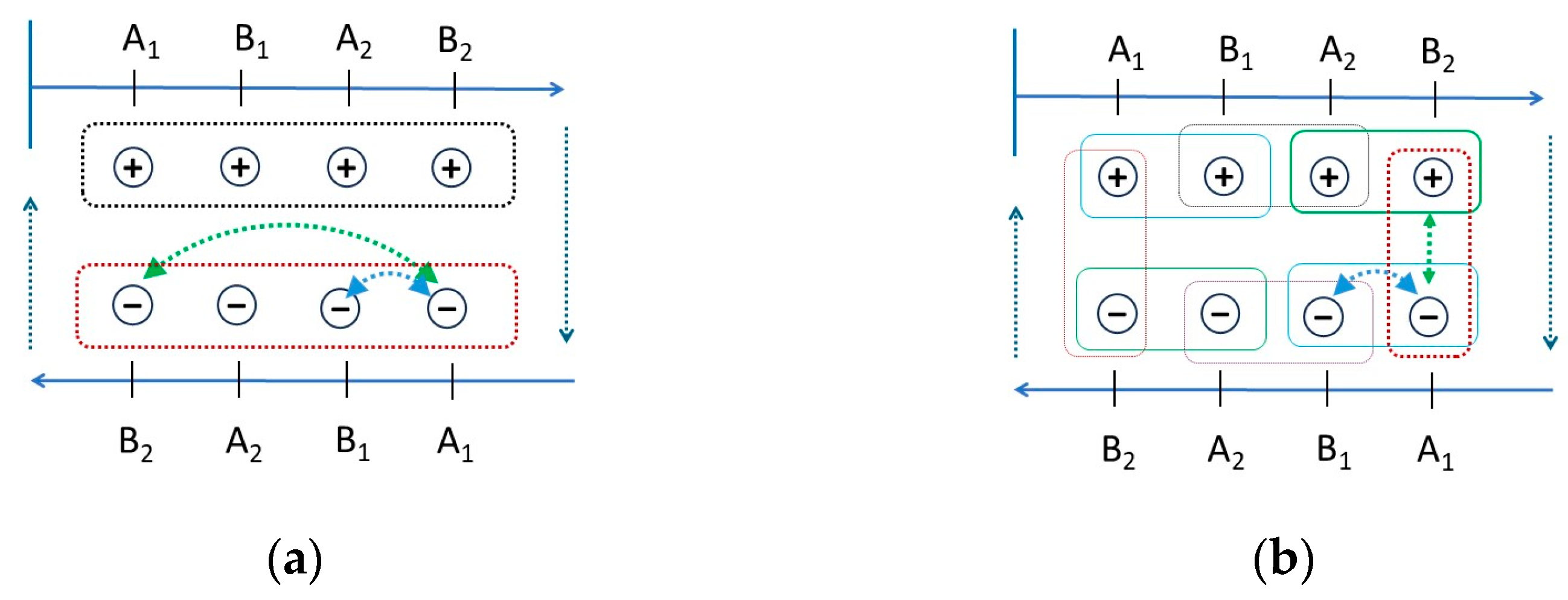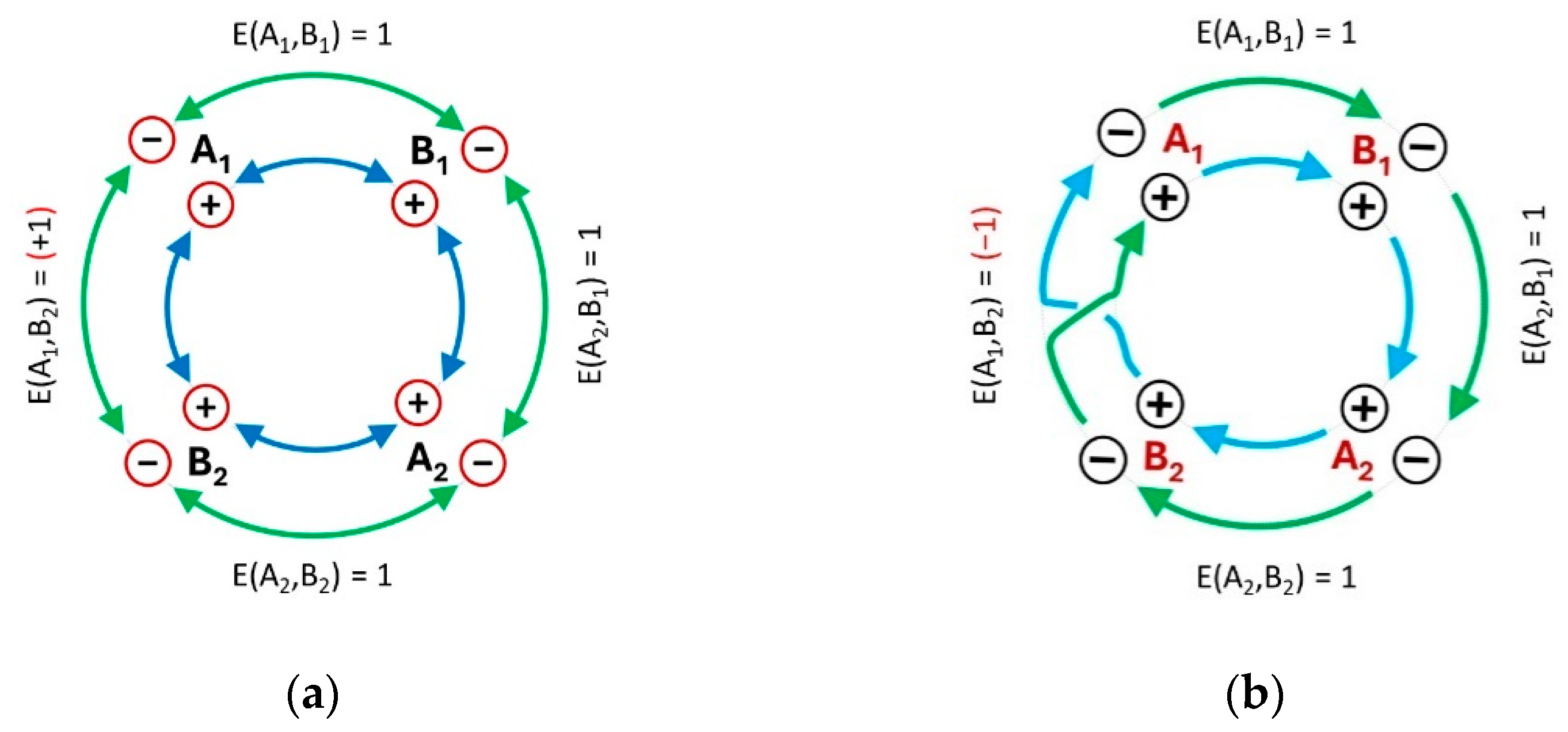 Figure 2b. The only possible combinations in this case are “+,−” and “−,+”, with an expectation value of (−1). If these values are plugged into the CHSH inequality, we obtain a maximal Bell violation: