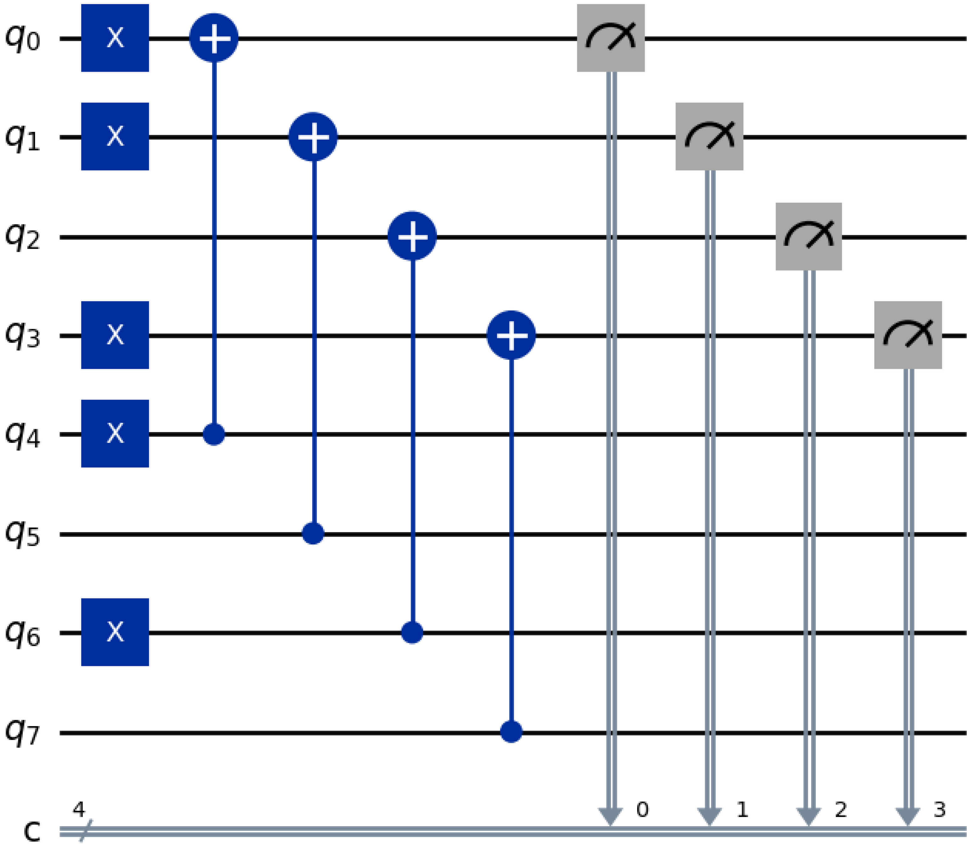 Figure 12, simulates modular addition using CNOT gates and ancillary qubits. This circuit loads the 4 bit segment of image data onto primary qubits, and a 4 bit quantum key is prepared on auxiliary qubits. A sequence of CNOT gates then applies a controlled bit-flip operation, implementing the XOR logic. This process yields a reversible, low-complexity encryption mechanism that is sensitive to key variations.