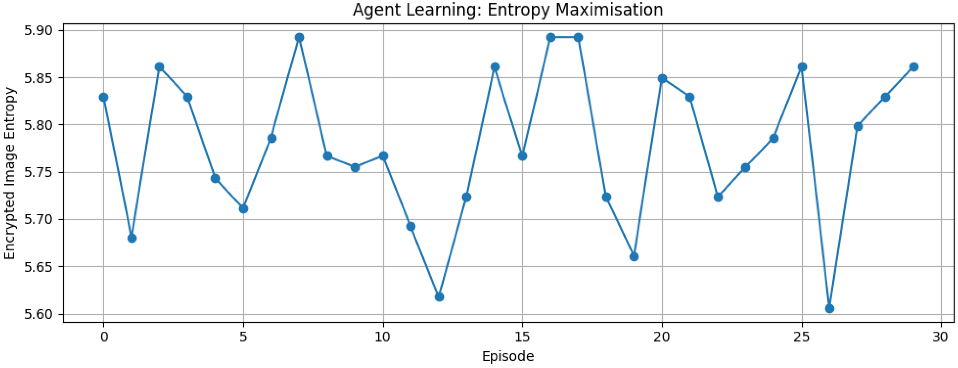 The agent is trained using a reinforcement learning loop with entropy maximization as the reward proxy. Over 30 episodes, the agent receives image entropy as input and selects one encryption action to apply to all image segments. The encrypted image’s entropy is computed, and negative entropy is used as the loss function for gradient descent optimization of the VQC parameters. This continuous feedback loop encourages the agent to favor transformations that yield higher visual randomness in ciphertexts.
