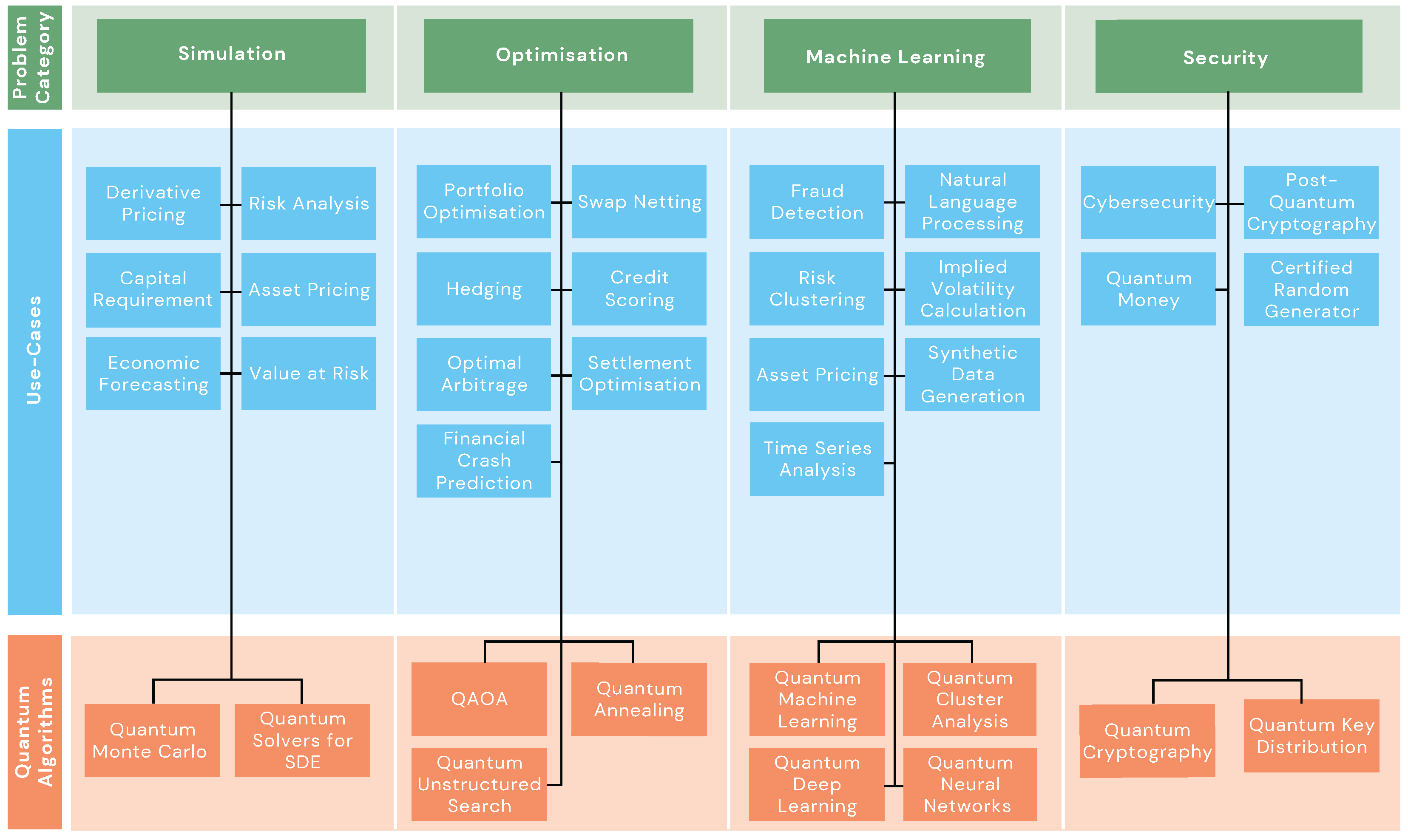 - Risk Management and Cybersecurity—presented in Section 3.2, we identify some of the simulation and security challenges in risk management and cybersecurity, respectively. Similar to banking and investment, we present the technical formulations of use cases of quantum computing in this category. This includes quantum approaches for risk analysis (Value at Risk, credit scoring, etc.) and fraud detection.