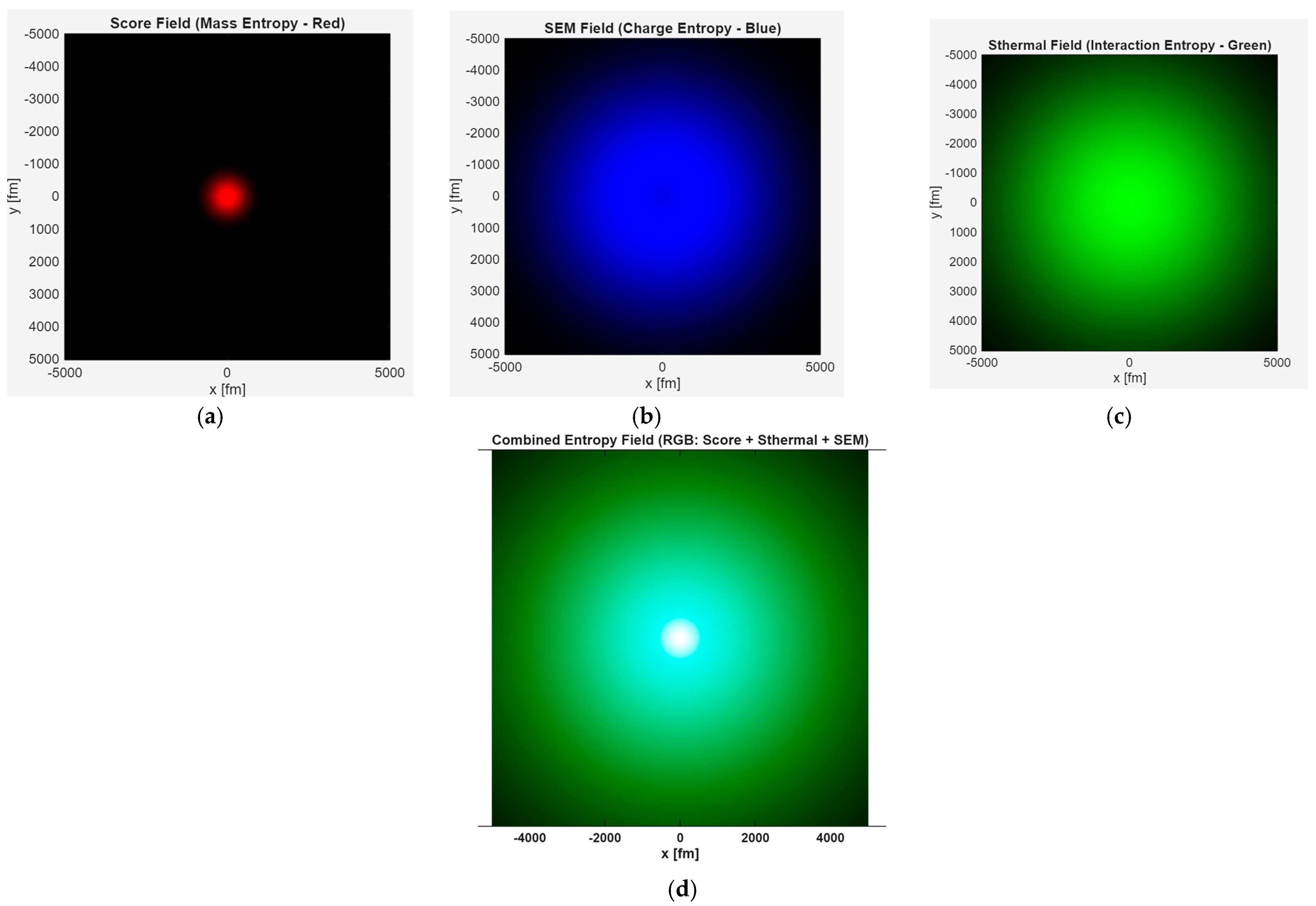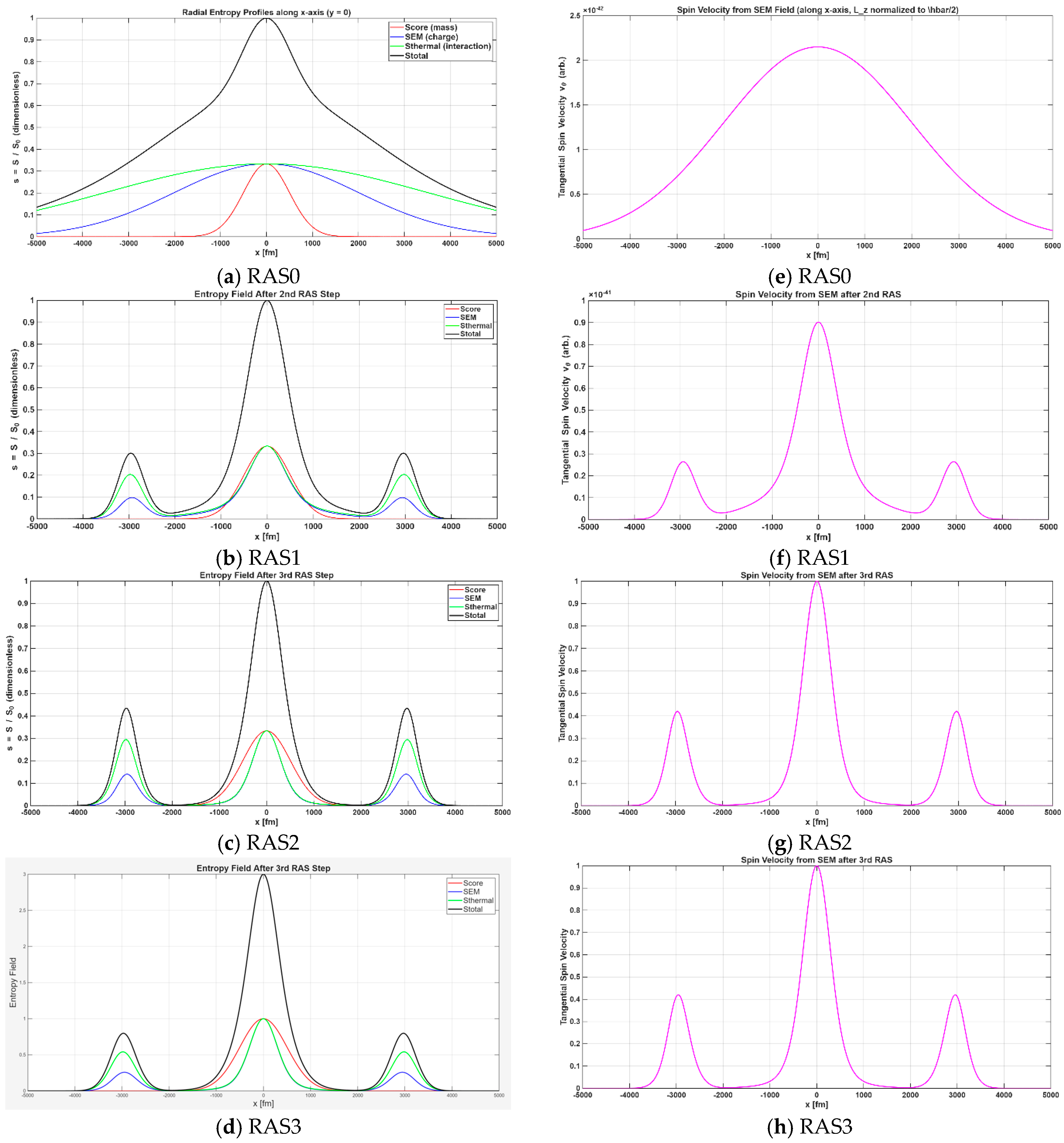 - RAS2—Threshold Convergence and Collapse Criteria Emerges: At the second recursive amplification step (RAS2), the behavior of the entropy field undergoes a dramatic transformation. All three core entropy components—score (mass), sEM (charge), and sthermal (interaction)—now appear almost fully collapsed and overlapping, forming a single dense central peak (Figure 8c): Key observations: (a) Trinity Field Convergence. For the first time, the red (score), blue (sEM), and green (sthermal) curves are no longer distinguishable in the core region. This convergence implies that their local mean entropies in the local area are equilibrated. The total entropy (black) thus becomes a sharply peaked structure, suggesting near-complete field unification.
