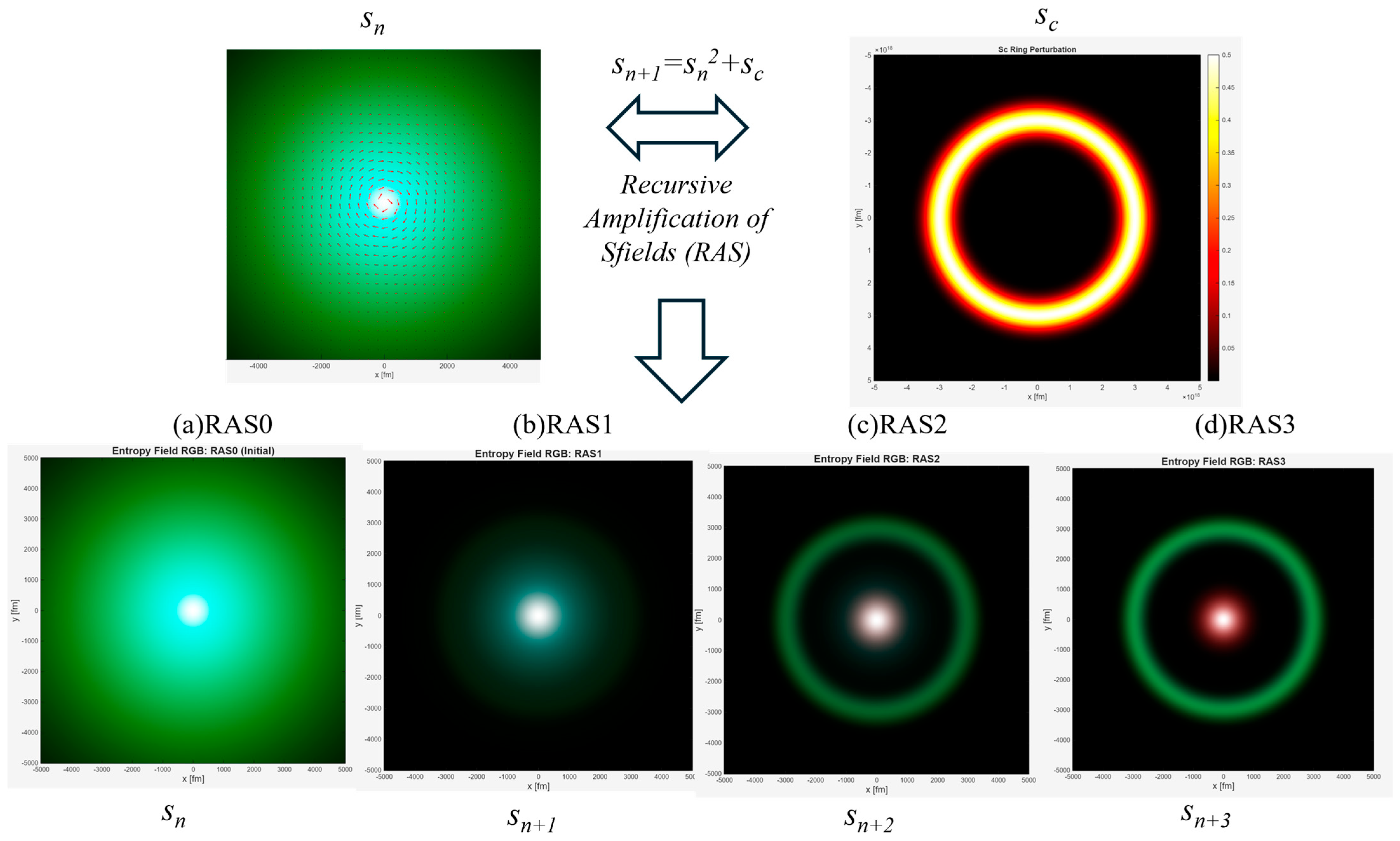 - RAS Step 1—Beginning of Collapse: Compression and New Structure Formation. In Figure 8b, we present the result of the first recursive amplification step (RAS1) applied to the electron’s non-dimensional entropy field using the update rule: sn+1 = sn2+sc (3). This process simulates the effect of an external entropy perturbation sc—such as a measurement photon—interacting with the native entropy field of the electron.